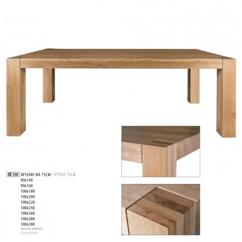 ST390 stolík vyrobený z masívneho dubového dreva, osloví tých, ktorí majú radi jednoduchosť v kombinácii s moderným. Jeho pevná forma a jednoduché prevedenie vám umožnia vytvoriť módny interiér jedálne alebo obývacej izby. Stôl je pevný a odolný vďaka použitým povrchovým úpravám. Moderný dizajn je taktiež viditeľný vďaka pôsobivému kombinovaniu noh so stolovou doskou. Ďalšou výhodou tohto modelu je množstvo dostupných veľkostí. Výška stola je 75 cm a hrúbka vrchnej dosky 4 cm.