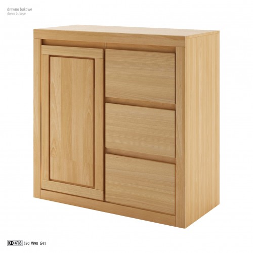 Malá buková komoda KD416 je dobrou cestou pre krásny dizajn interiéru a dostatok priestoru na uskladnenie. Udržiavaná v módnom minimalistickom štýle, zaujme jednoduchosťou formy. Komfortná skrinka a funkčné zásuvky umožňujú praktické a pohodlné uloženie domácich predmetov. Priestranná komoda je dokonalým miestom pre vystavenie dekorácie, rodinnej fotografie alebo nastavenie krásnej lampy, ktorá osvetlí interiér vášho domova.