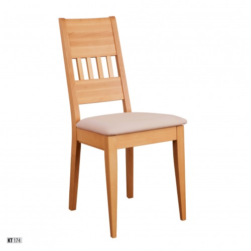 Stolička KT174 je vyrobená z masívneho bukového dreva a kombinuje tradičný s moderným dizajnom. Používa sa čalúnené sedadlo a mierne sklonené operadlo. Dostupné tkaniny: prírodná koža alebo látka.
