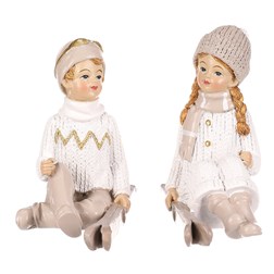 Chlapec a dívka s lyžemi, sedící - polyresin, béžoví, cena za 1 ks