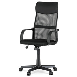 Oblíbená a nadčasová kancelářská židle decentní černé barvy je vhodná nejen do kanceláří, ale například i pro Home office. Vysoký trubkový opěrák s bederní opěrkou je potažen černou síťovinou MESH a v horní části jako podhlavník slouží velmi praktický potah z černé ekokůže. Použité materiály na sedáku i zádové části opěráku zaručují dokonalou prodyšnost. Příjemný polstrovaný sedák je potažený černou látkou MESH. Výplň je v kvalitní PU pěny, která zaručuje příjemné dlouhodobé sezení. Ruce si můžete pohodlně opřít o 6 cm široké černé plastové područky s velkou ložnou plochou 35 cm. Područky zároveň slouží jako velmi pevné spojovací díly sedáku s opěrákem. Díky kvalitnímu plynovému pístu je židle výškově nastavitelná, vybavená houpacím mechanismem a velkým aretačním šroubem na úpravu tuhosti pohupu, který je umístěn pod sedákem. Správnou stabilitu a pevnost zajišťuje pětiramenný černý plastový kříž o pr. 60 cm s plastovými kolečky vhodnými na koberce. Nosnost židle je až 120 kg.