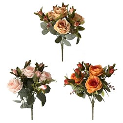 Kytice z umělých růží v tlumených odstínech růžové, oranžové a červené, přináší do vašeho prostředí podzimní atmosféru s téměř nerozeznatelnými květinami od skutečných. Tyto trvanlivé květinové dekorace zůstávají stále jako čerstvé, aniž by časem uvadly nebo hrozilo opadání okvětních lístků. Nechte kytici vyniknout samostatně v krásné váze, jenž bude zdobit stoly, poličky, okenní parapety a další dobře viditelná místa. S jejím realistickým vzhledem a trvanlivostí představuje skvělý doplněk pro každý interiér i venkovní prostory, bez nutnosti péče a údržby.