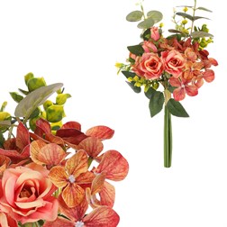 Tato exkluzivní umělá kytice představuje harmonický mix květů hortenzie a růže v oranžovém odstínu, který je vhodný pro rozmanité příležitosti. Hodí se na výzdobu nejrůznějších oslav, společenských událostí a dalších. Může ale být i sama o sobě pěknou ozdobou u vás doma. Krása této kytice vyzařuje do okolí, a zvolením vhodné vázy ji ještě umocníte. Její nespornou výhodou je, že její trvalá krása nikdy neuvadne. Každý květ v této kytici je pečlivě vytvořen tak, aby vypadal jako živý a v plném rozkvětu. Získáte nádhernou květinovou výzdobu, která vydrží na věky bez nutnosti údržby a péče.