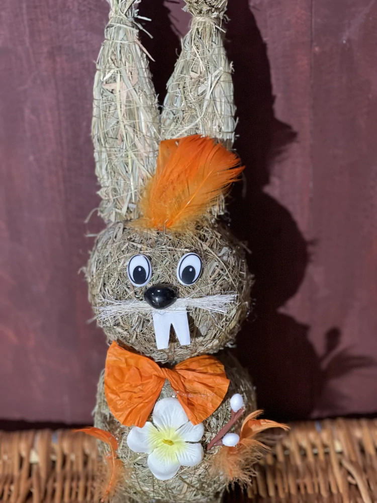 Zajac je ručne vyrobený zo slamy. Z materiálov, ako je slama, textil a perie.