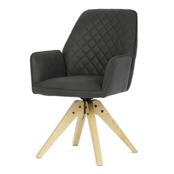 Jídelní židle s područkami potažená v textilii imitující broušenou kůži. Záda a opěrák jsou efektně prošity ve tvaru diamantu. Barva prošití je v barvě potahového materiálu. Nohy jsou z lakovaného jasanového dřeva, mořeny v odstínu dub. Sedák je otočný o 180° s tvarovou pamětí.